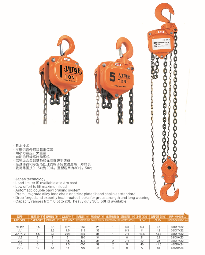 ·載荷范圍從0.5噸到20噸,重型葫蘆有30噸,50噸。